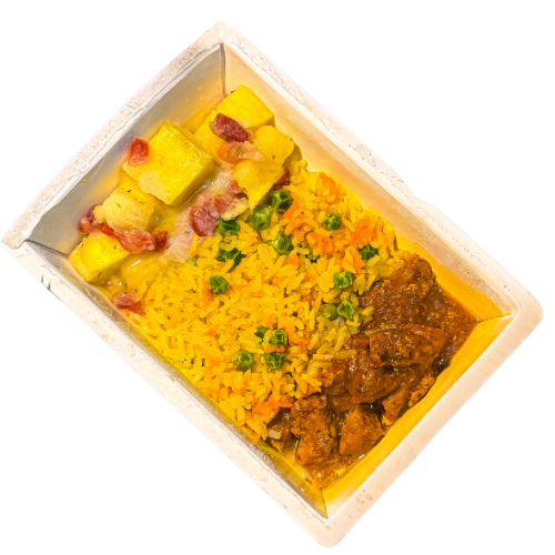 Assado em cubos, acompanha mandioca ao molho branco e bacon, arroz com cenoura e ervilha