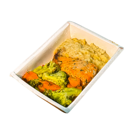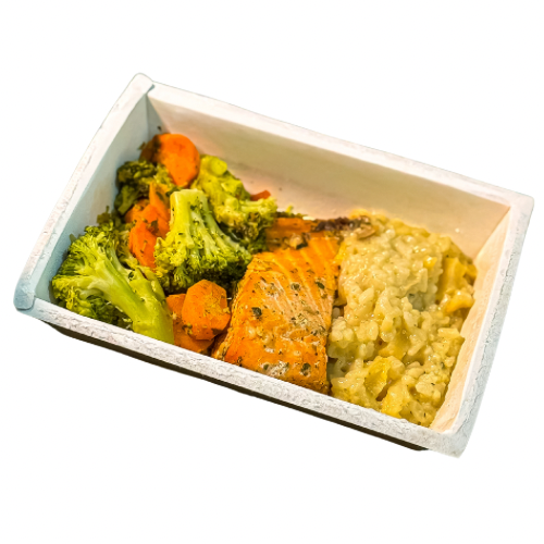 Rlsoto cremoso com pêra e gorgonzola com salmão grelhado e brócolis com cenoura salteados na manteiga