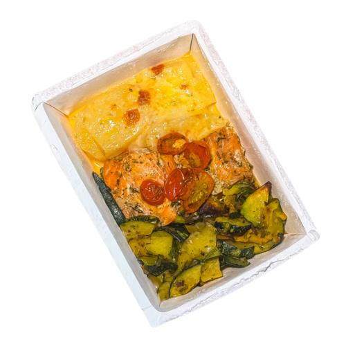 Filé de salmão grelhado com tomates cerejas confitados, aocmpanha batata gratinada e abobrinha grelhada