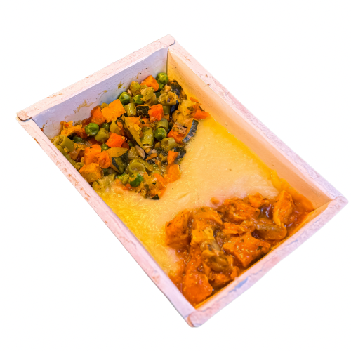 Acompanha purê de batata e seleta de legumes